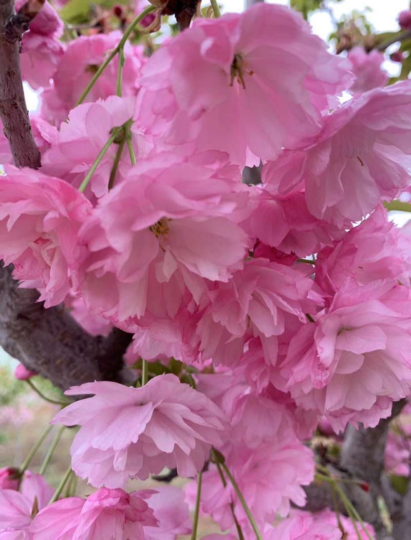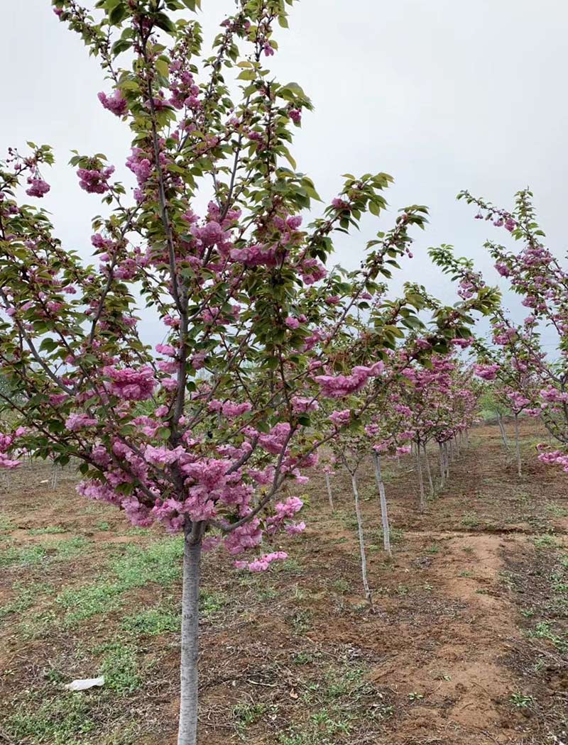 大山櫻系園藝栽培品種。小喬木,杯狀樹形。幼葉黃綠色。花葉同放,花下垂,花徑約5.0cm;花梗細(xì)長;萼筒漏斗狀,萼片三角形,全緣;花瓣30~40枚,紫紅色,外側(cè)花瓣近圓形,色較深,花瓣呈螺旋狀排列;雌蕊1枚,下部葉化。花期較長,可持續(xù)半個月以上,日照市花期為4月中下旬。