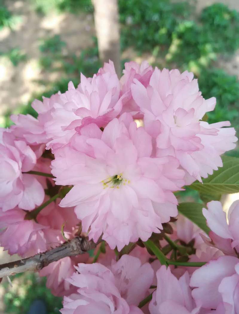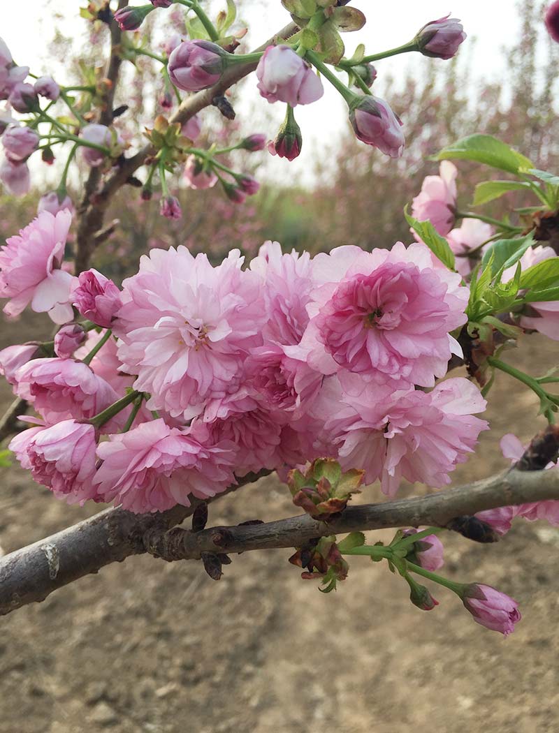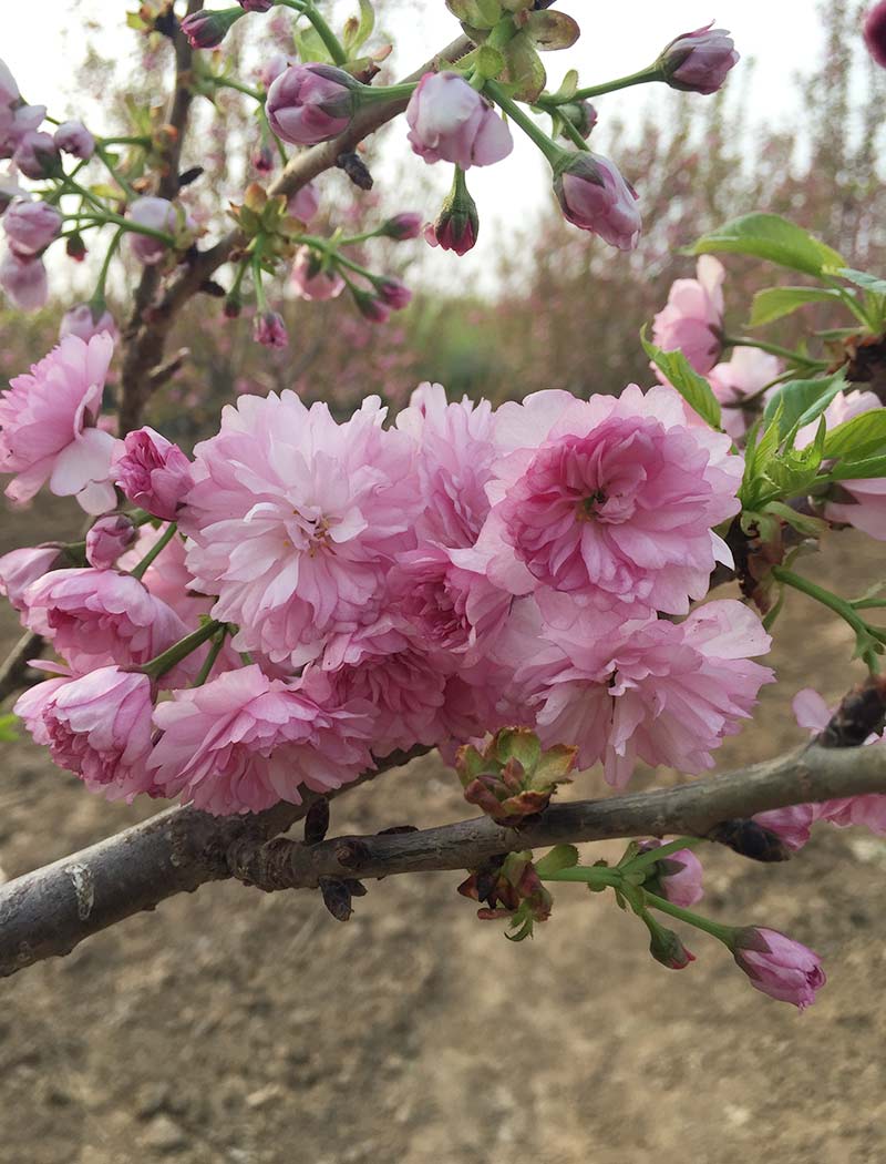 山櫻系園藝栽培品種。小喬木,杯狀樹(shù)形。幼葉綠褐色。花葉同放,花徑3.6~4.6cm;萼筒漏斗狀,萼片卵狀三角形,起伏不平,邊緣鋸齒明顯( 這是與“關(guān)山”的明顯區(qū)別);花瓣30~50枚,紫紅色,部分淡紅色,近圓形,花蕾時(shí)顏色較深,開(kāi)花后顏色漸淡;雌蕊1~2枚,葉化。日照市花期為4月中下旬。