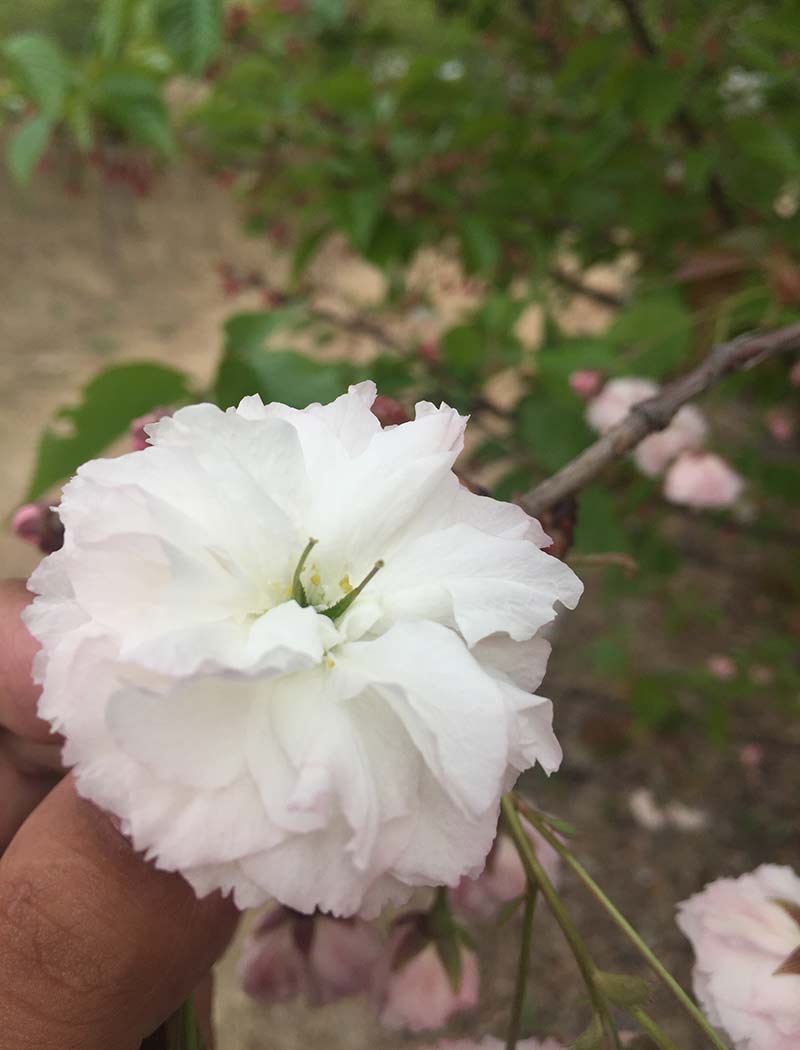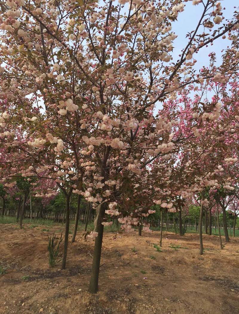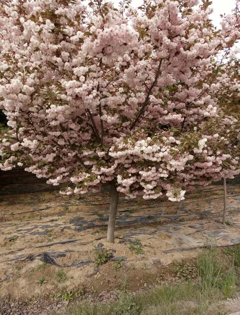 山櫻系園藝栽培品種。喬木,傘狀樹形。枝條斜上伸展。幼葉紫褐色?;ㄈ~同放,花下垂,花徑4.2~5.2cm;萼筒短漏斗狀,無毛,有棱凸起,萼片三角形,邊緣鋸齒明顯;花瓣20~50枚,淡紅色,外側花瓣淡粉色,部位近白色雌蕊2枚,葉化,顯著突出,似普賢菩薩坐騎的鼻子,品種由此得名。日照市花期為4月下旬。