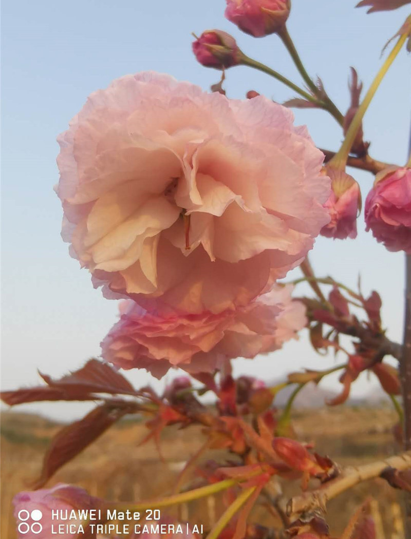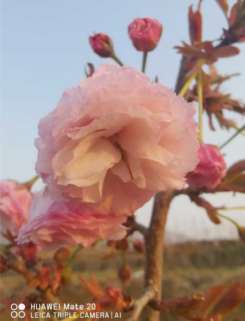 福祿壽品種的實生植株中選育的品種。喬木,傘狀樹形。幼葉黃綠色至褐色。花葉同放,花下垂,花徑5.0~6.0cm;萼筒短漏斗狀,萼片寬卵狀三角形,邊緣有鋸齒;花瓣30~40枚,淡紫紅色,近圓形,先端嚙齒明顯;雌蕊1~2枚,葉化,呈傘柄狀,突出明顯。日照市花期為4月下旬。