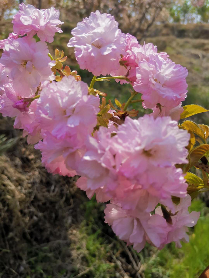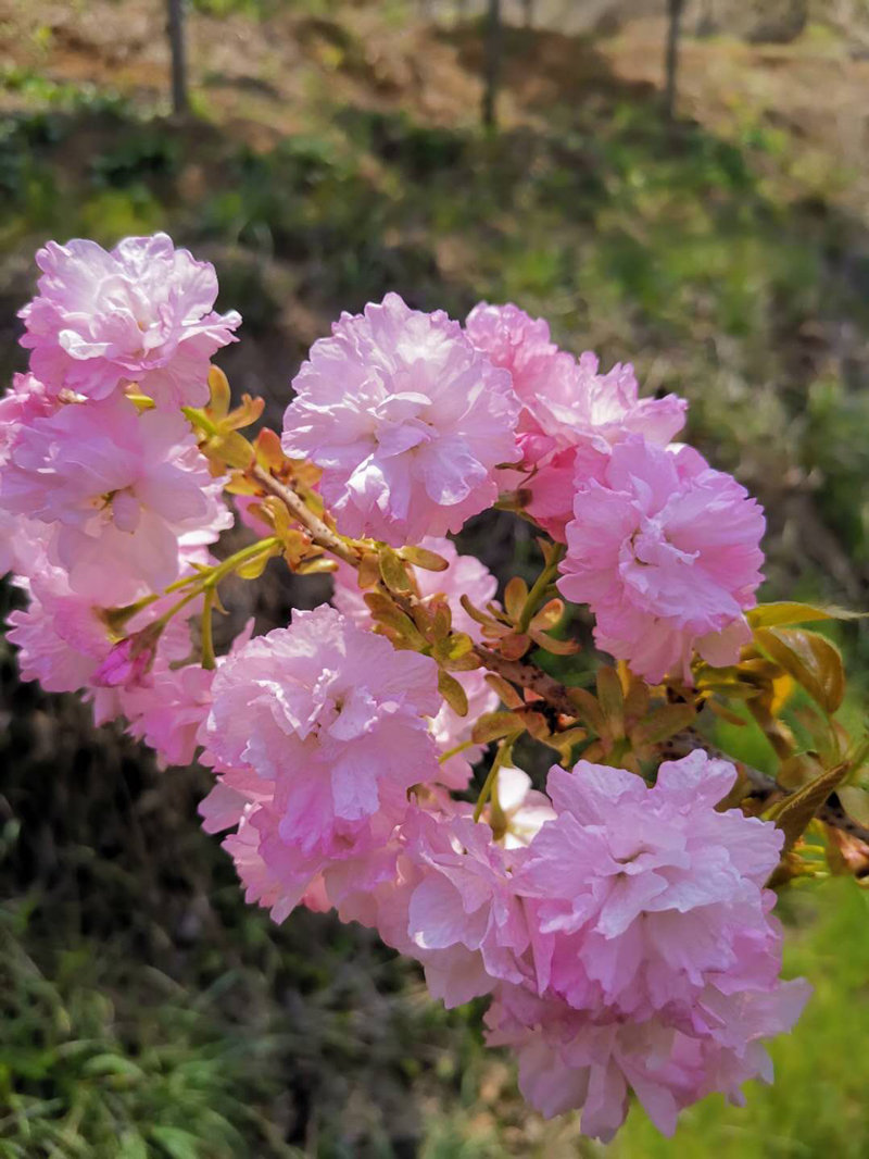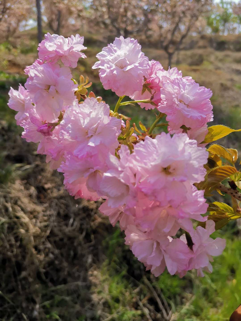 江戶系園藝栽培品種。小喬木,傘狀樹形。幼葉茶褐色。花葉同放,花徑4.5~5.0cm: 尊筒漏斗狀鐘形,尊片三角形,全緣;花瓣15~20枚,淡紅色,外側花瓣色較深;雌蕊1~2枚,葉化,有鋸齒。集束開花,在枝條頂端呈球狀,此得名。日照市花期為4月中旬。