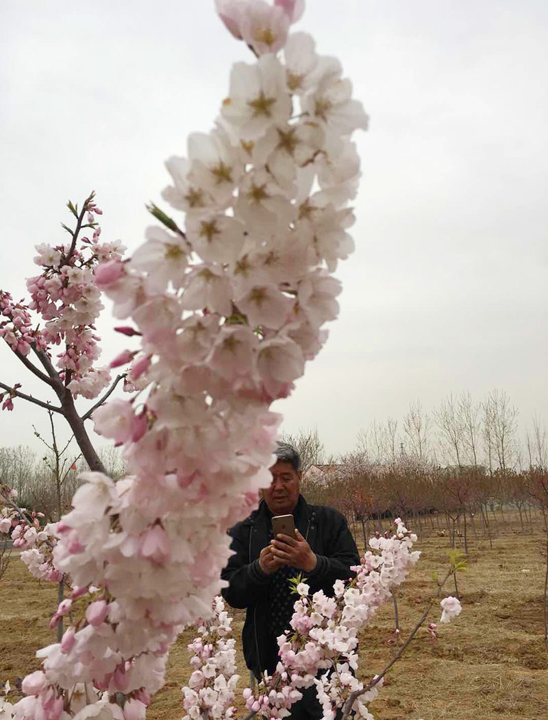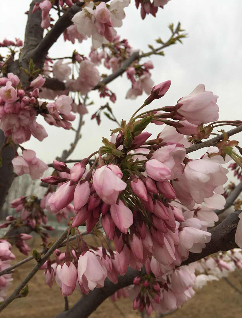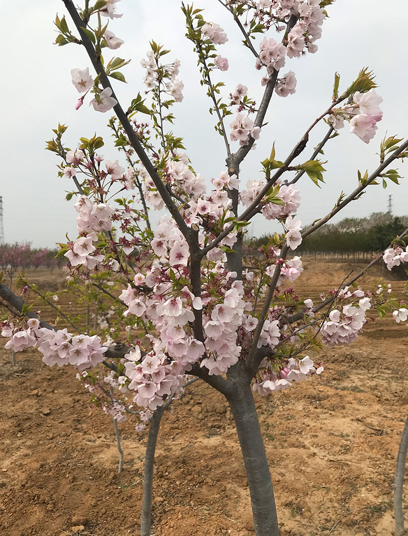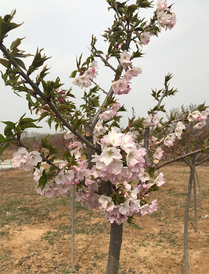 從染井吉野實生植株中選育的品種,形態特征與染井吉野相似。喬木,傘狀樹形。總狀傘形花序,有花5~8朵;開花時枝頂抽發新葉,花徑約3.0cm;萼筒管狀,萼片長卵狀三角形,邊緣有少量鋸齒;花瓣5枚,淡紅白色,花心紫紅色。花期比染井吉野稍晚。日照市花期為4月上中旬。
