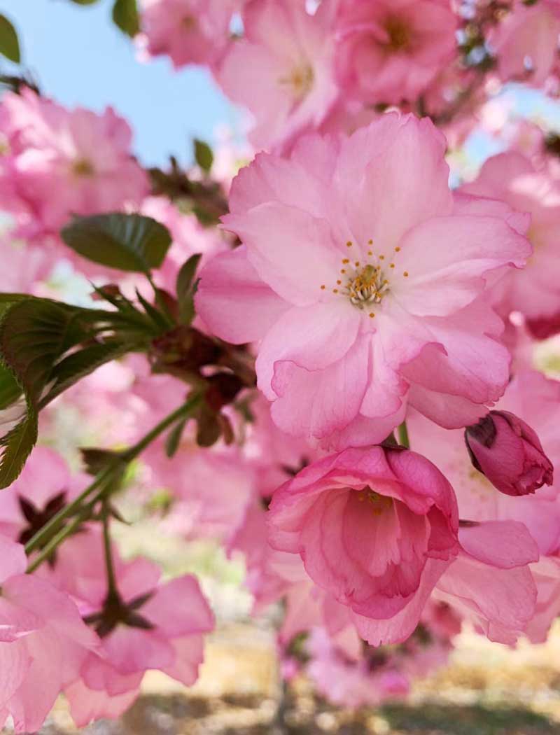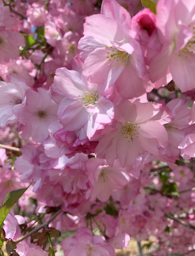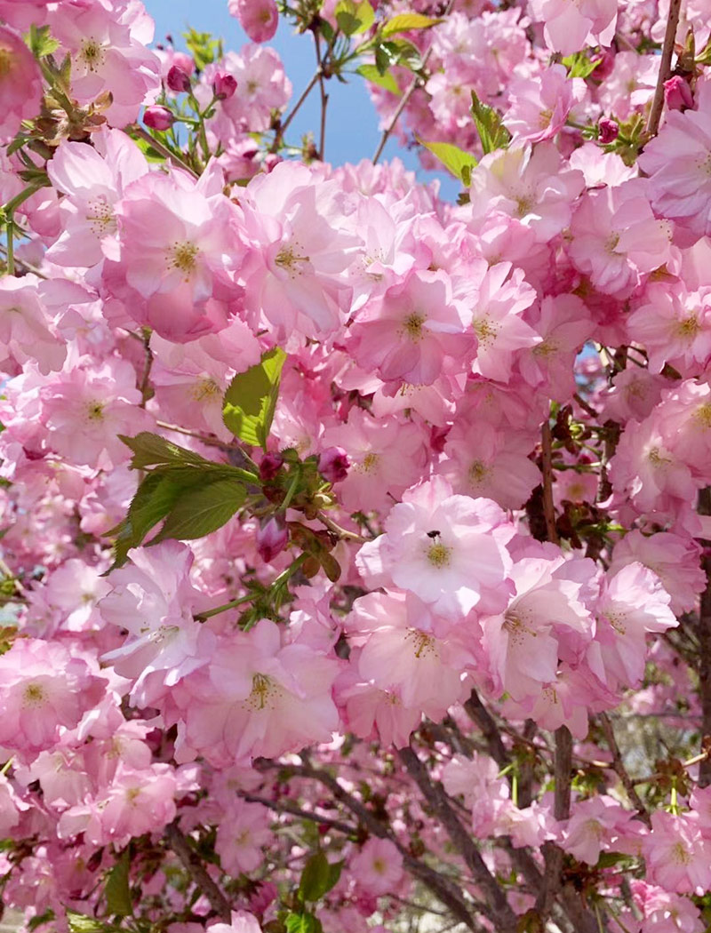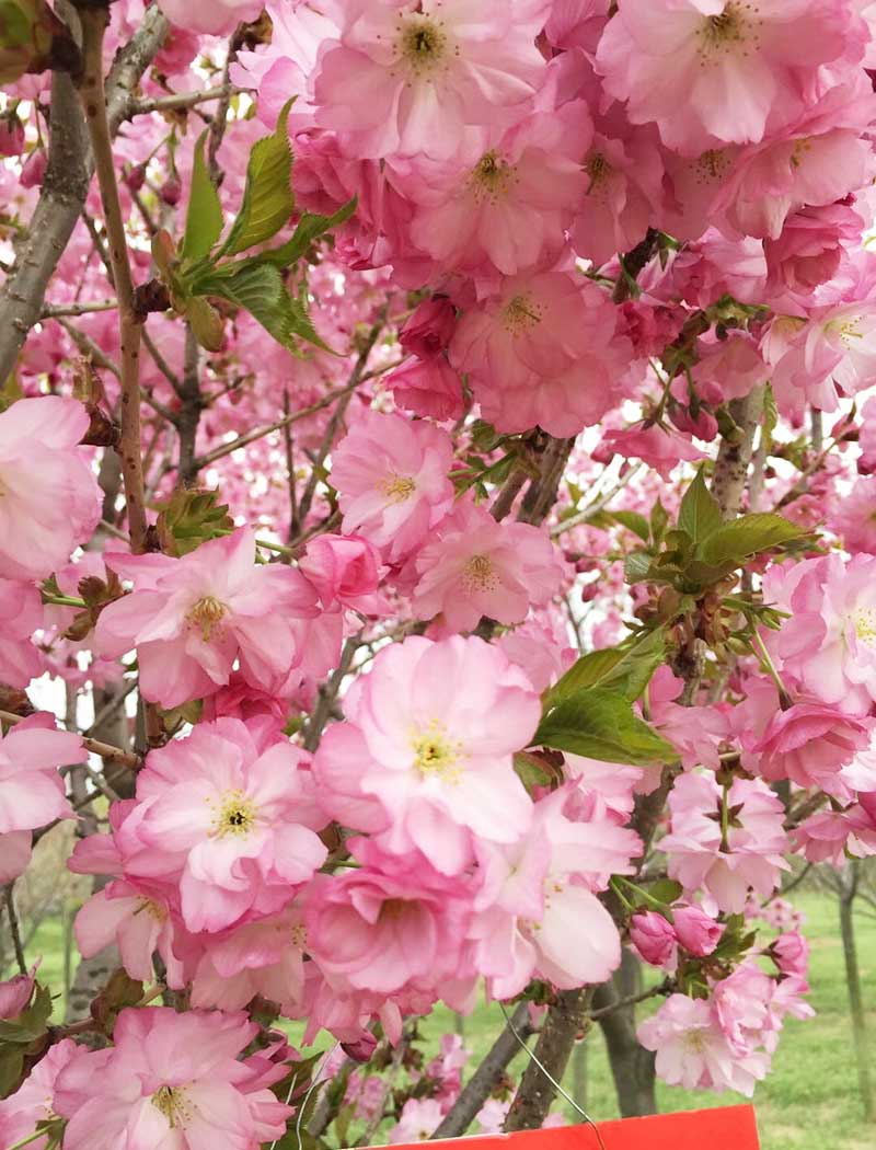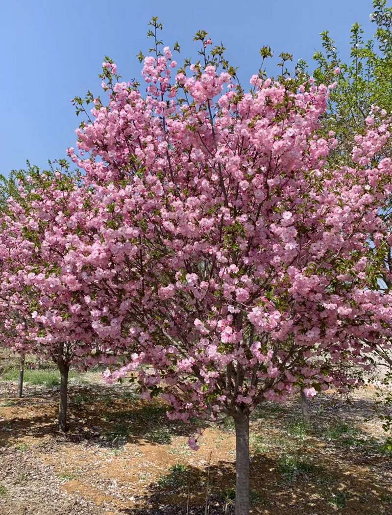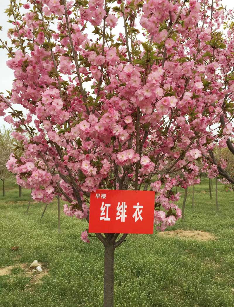 松前早咲與龍云院紅八重雜交品種。小喬木,杯狀樹形。幼葉褐色。花近先葉開放,有芳香,花徑4.8~5.5cm;萼筒鐘狀,萼片卵狀三角形,全緣;花瓣15~18枚,淡紫紅色,由近白色漸變成紫紅色,脈紋明顯。花梗、萼筒、萼片均無毛。為重瓣櫻中較早開放的品種。日照市花期為4月中旬。