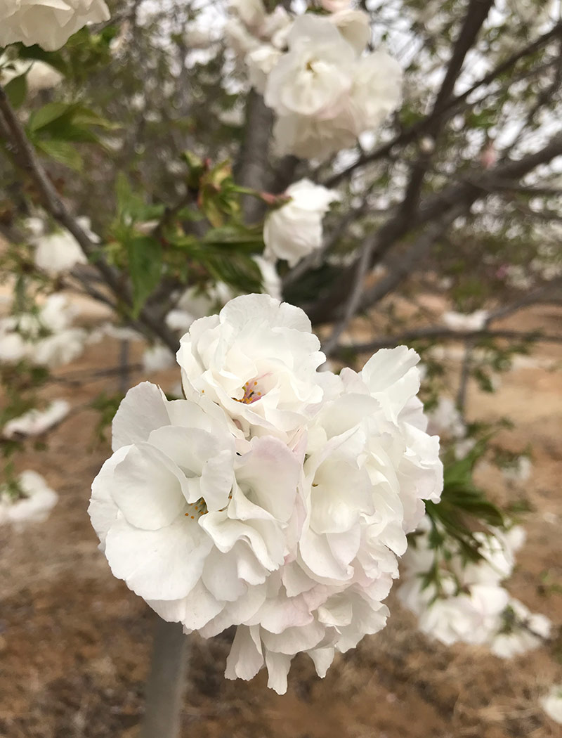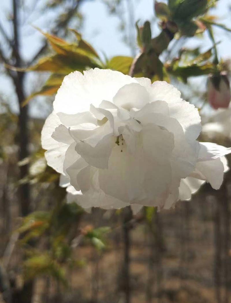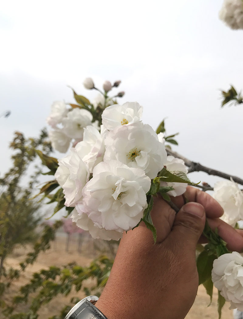 山櫻系園藝栽培品種。喬木,杯狀樹形。幼葉黃綠色。傘形花序,有花3~5朵;花近先葉開放,略下垂,有淡香,花徑4.0-5.0cm:萼筒漏斗狀長鐘形,萼片長卵狀三角形呈舟形,先端漸尖,邊緣有少數鋸齒花瓣10-20枚,白色,外瓣先端略顯淡紅色,近圓形,先端淺2裂。日照市花期為4月中旬。