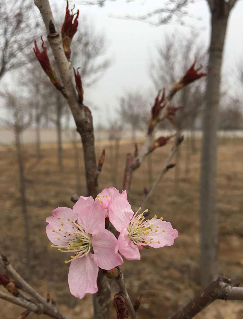 寒緋櫻與櫻桃的雜交品種。小喬木,傘狀或?qū)捖褷顦湫巍;ㄏ热~開放,在短花枝上密集著生,花徑2.4~3.0cm;萼筒鐘狀杯形,無毛,萼片卵狀三角形,全緣,有毛;花瓣5枚,淡紅色,向內(nèi)彎曲,整朵花呈寬杯狀,花瓣橢圓形至卵形,先端2裂較深。日照市花期為3月中下旬。